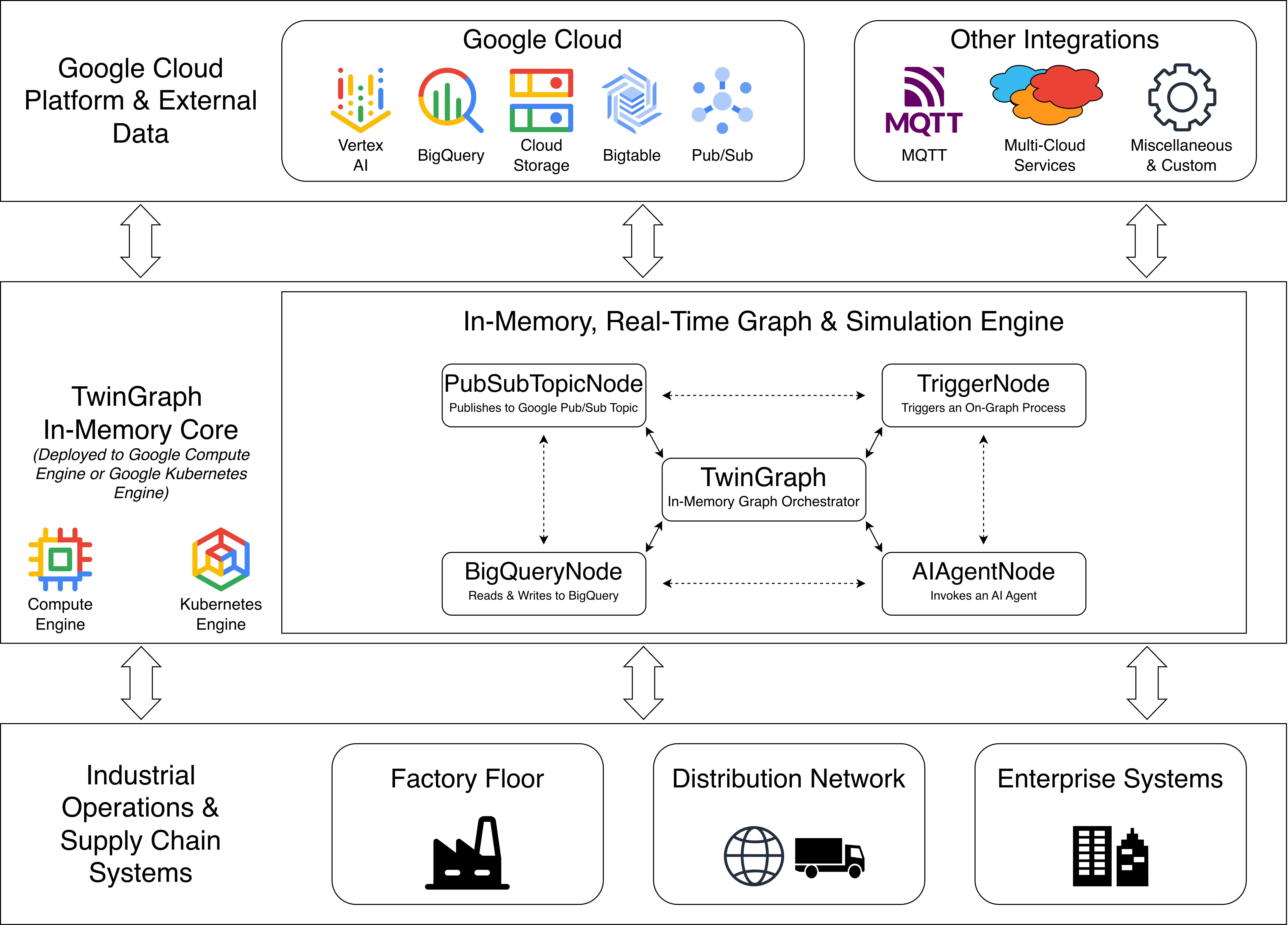 By integrating TwinGraph SDK with Google Cloud's Data and AI ecosystem, organizations can build a "living" digital nervous system. This combination allows for the transformation of fragmented data into an executable intelligence layer that optimizes their supply chain. TwinGraph SDK provides the backbone for intelligent industrial operations. An in-memory graph framework that unifies real-time data, persistent storage, and AI logic into a responsive 'nervous system' for modern factories, distribution networks, and enterprise-grade digital twins (See Figure 1). By maintaining the entire operational model in memory, it bypasses the latency of traditional databases, enabling sub-second graph traversals and real-time causal reasoning across complex industrial assets. It functions as an open, developer-centric bridge that unifies disparate data streams—including real-time OT telemetry, IT transactional records, and engineering specifications into a single, executable model of reality that eliminates vendor lock-in and scales within existing scientific computing ecosystems.