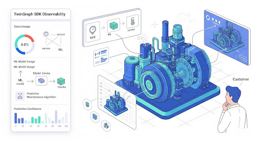 - Example - An MDE customer is relying on their digital twin for predictive maintenance. TwinGraph SDK's inherent observability allows them to track the lineage of data points from MDE (e.g., sensor readings), how they were used in the twin's ML models, and the confidence levels of the predictions, providing an audit trail and ensuring trust in the twin's recommendations.